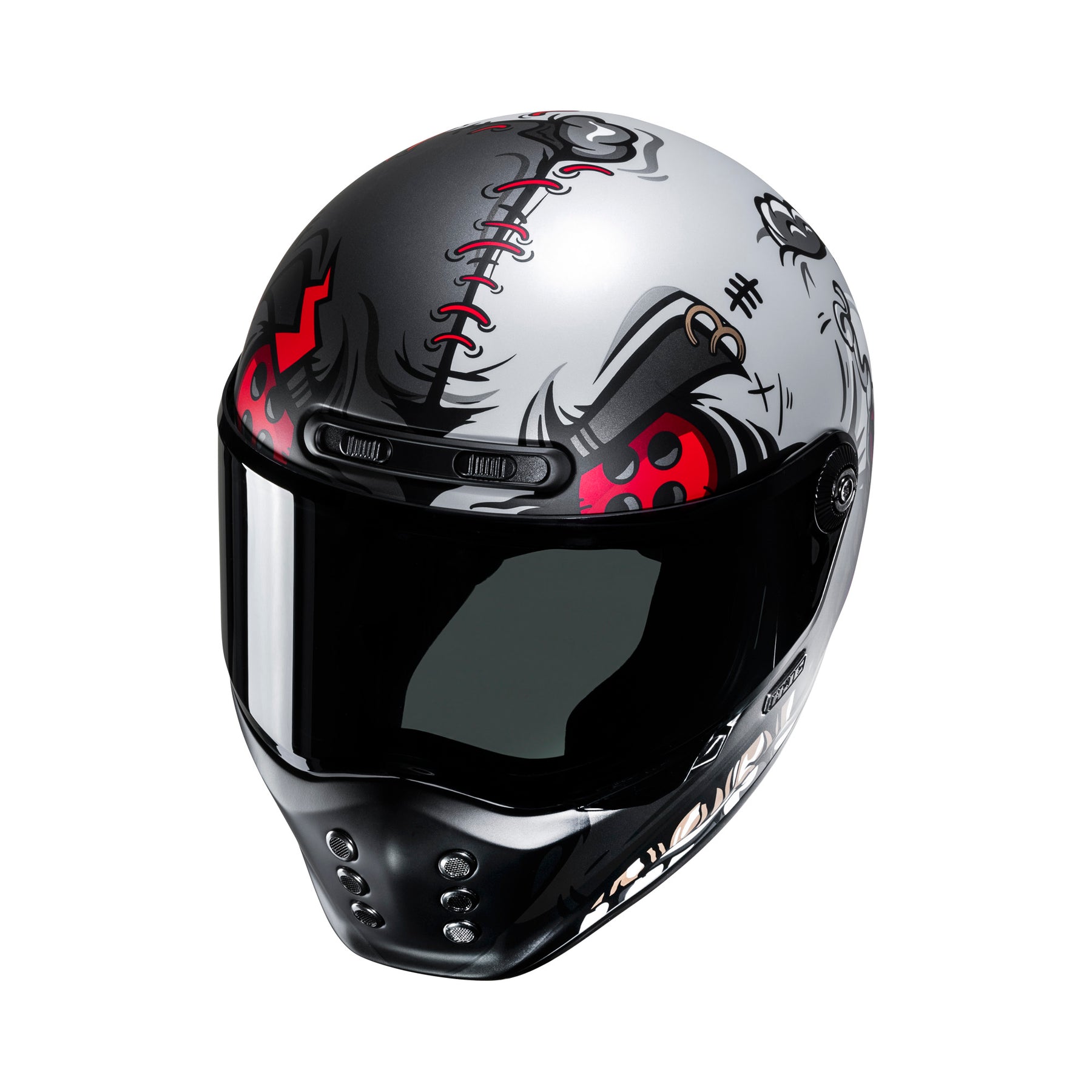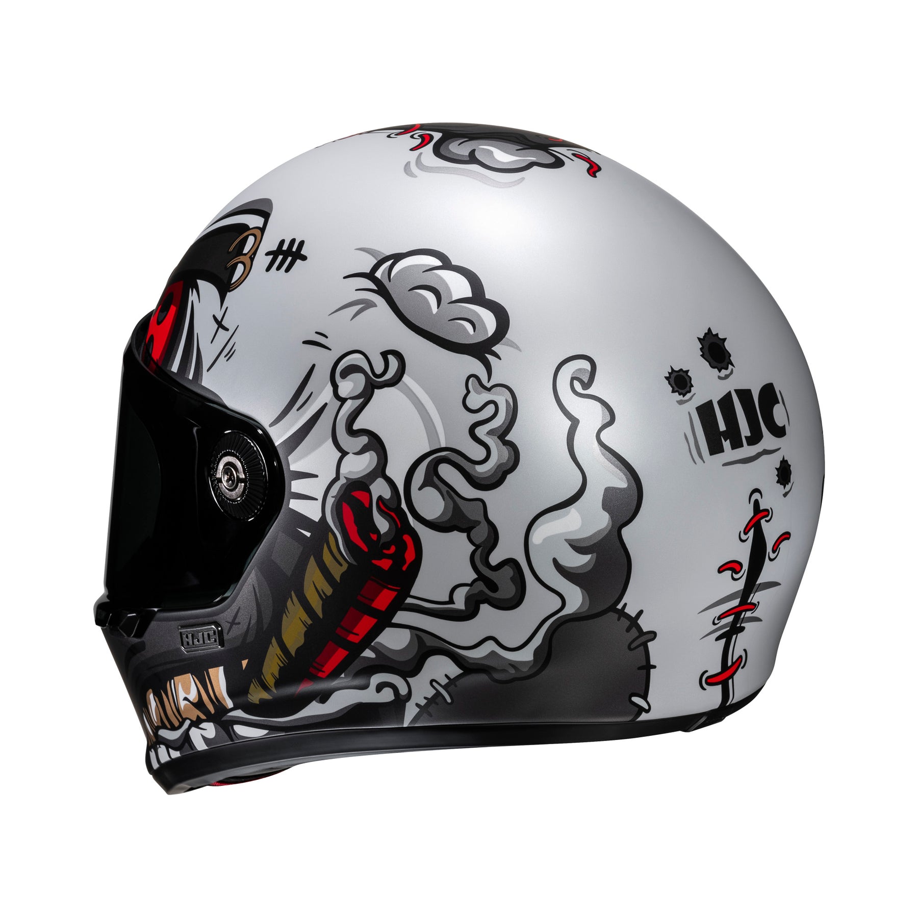 De V10 gaat verder dan de vintage-look met new-age-kenmerken zoals een lichtgewicht omhulsel van glasvezel, aerodynamische prestaties, noodlipjes voor extra veiligheid, uitneembaar en wasbaar interieur en gemakkelijke bouten voor een snelle vervanging van het vizier. Deze helm is voorbereid voor het Smart HJC Bluetooth communicatiesysteem.