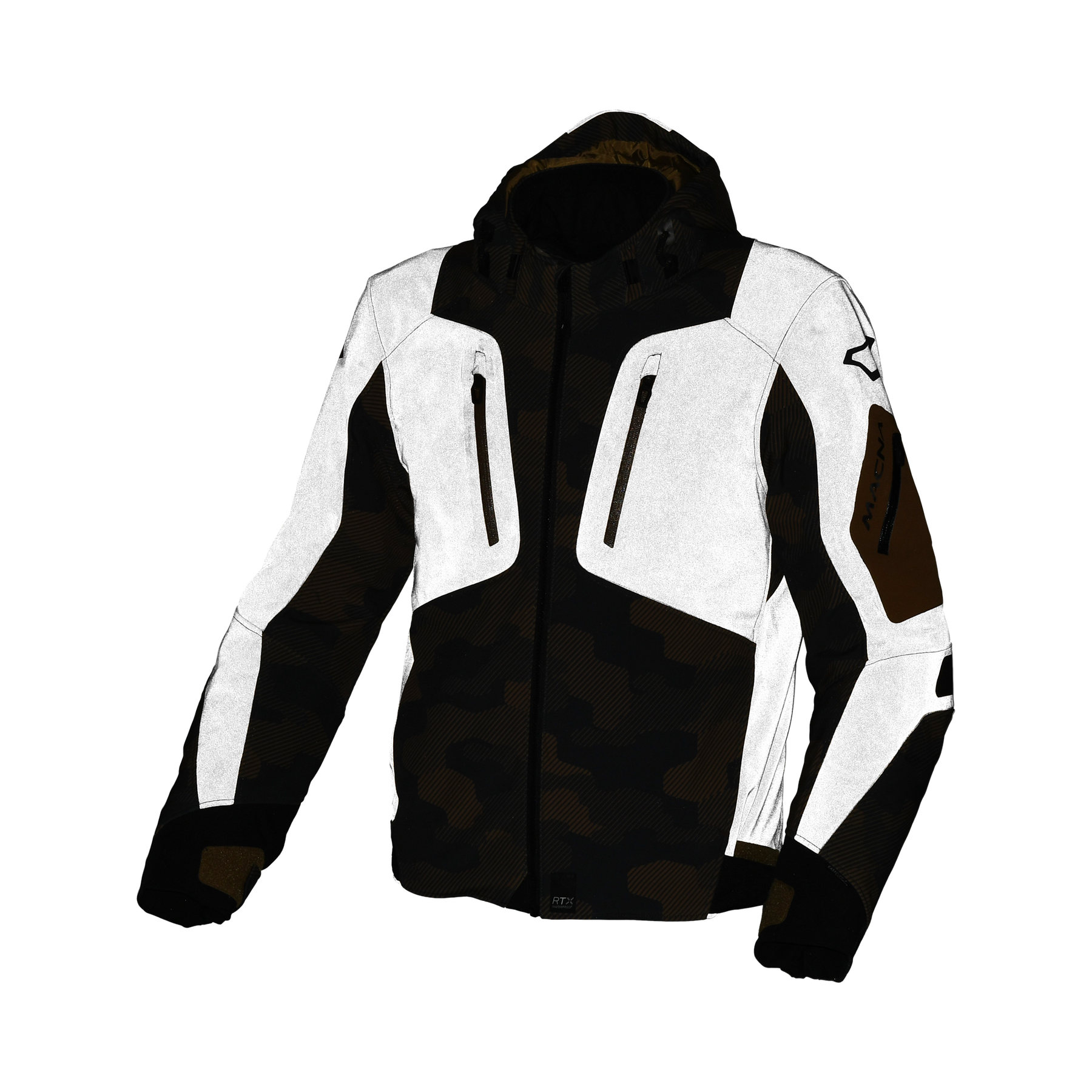 De Angle is gemaakt van een softshell en panelen van Night Eye™: stof die bestaat uit microscopisch kleine schoteltjes die licht reflecteren zodat de drager opvalt, vergelijkbaar met high-viz kleding en verkeersborden.