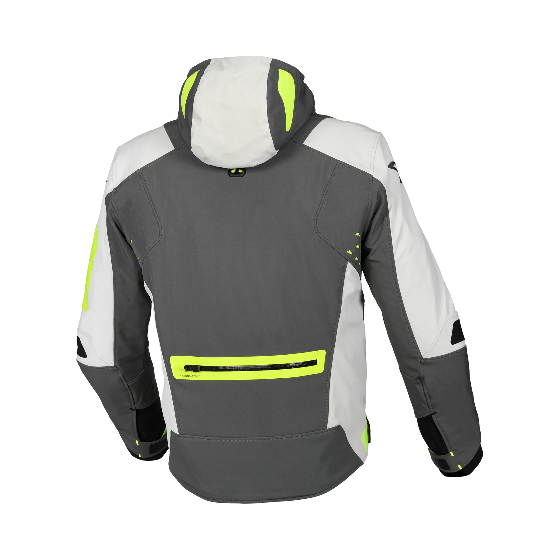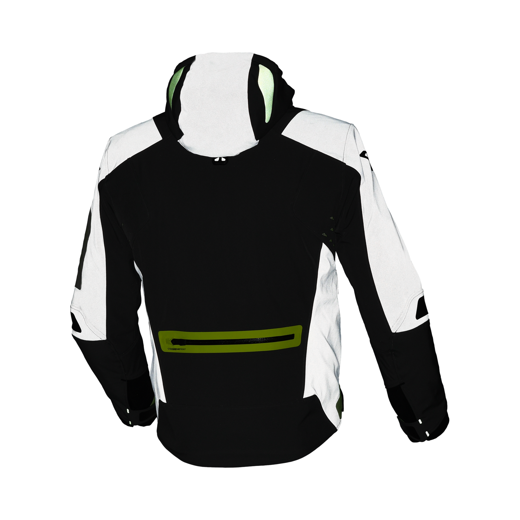 Om de Angle zomerproof te maken, hebben we gekozen voor grote ventilatieritsen op de borst en een luchtuitlaat op de rug. Zo kan de lucht de jas verlaten via de rug of via de lasergesneden ventilatieopeningen onder de oksels.