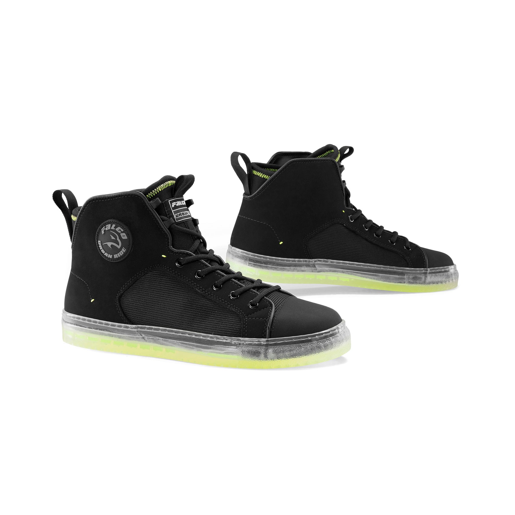 • Duurzame transparante rubberen zool met fluo gele of rode doorkijk.
